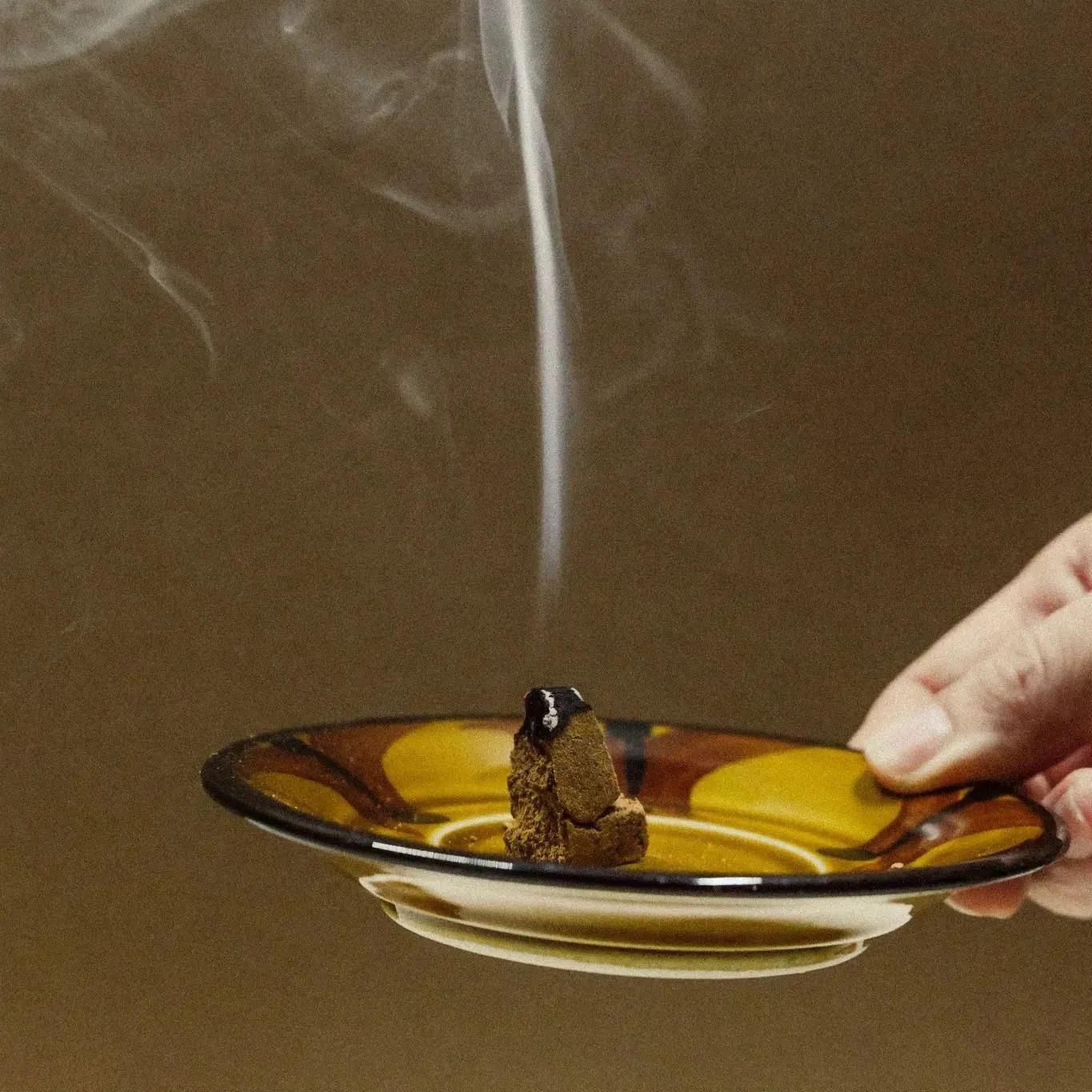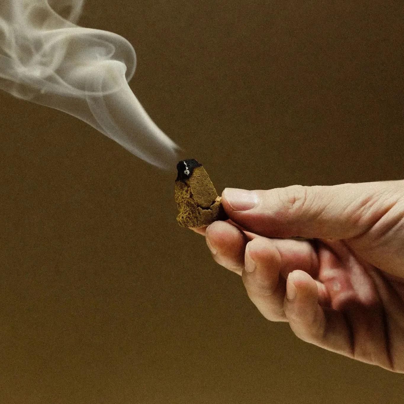 燃焼時間は約30分から40分です。小さく砕き、耐熱皿に乗せて焚きます。少量でもしっかりと燃え、燃焼した後も20分ほどスモーキーでありながら甘さのある、リラックスができるアロマが空間に残ります。広い空間や外で使う際には丸ごと一本を焚くこともできます。燃焼部分が大きいことで熱量が多くなり、燃焼時間は短くなりますが、香りの放出は高まります。