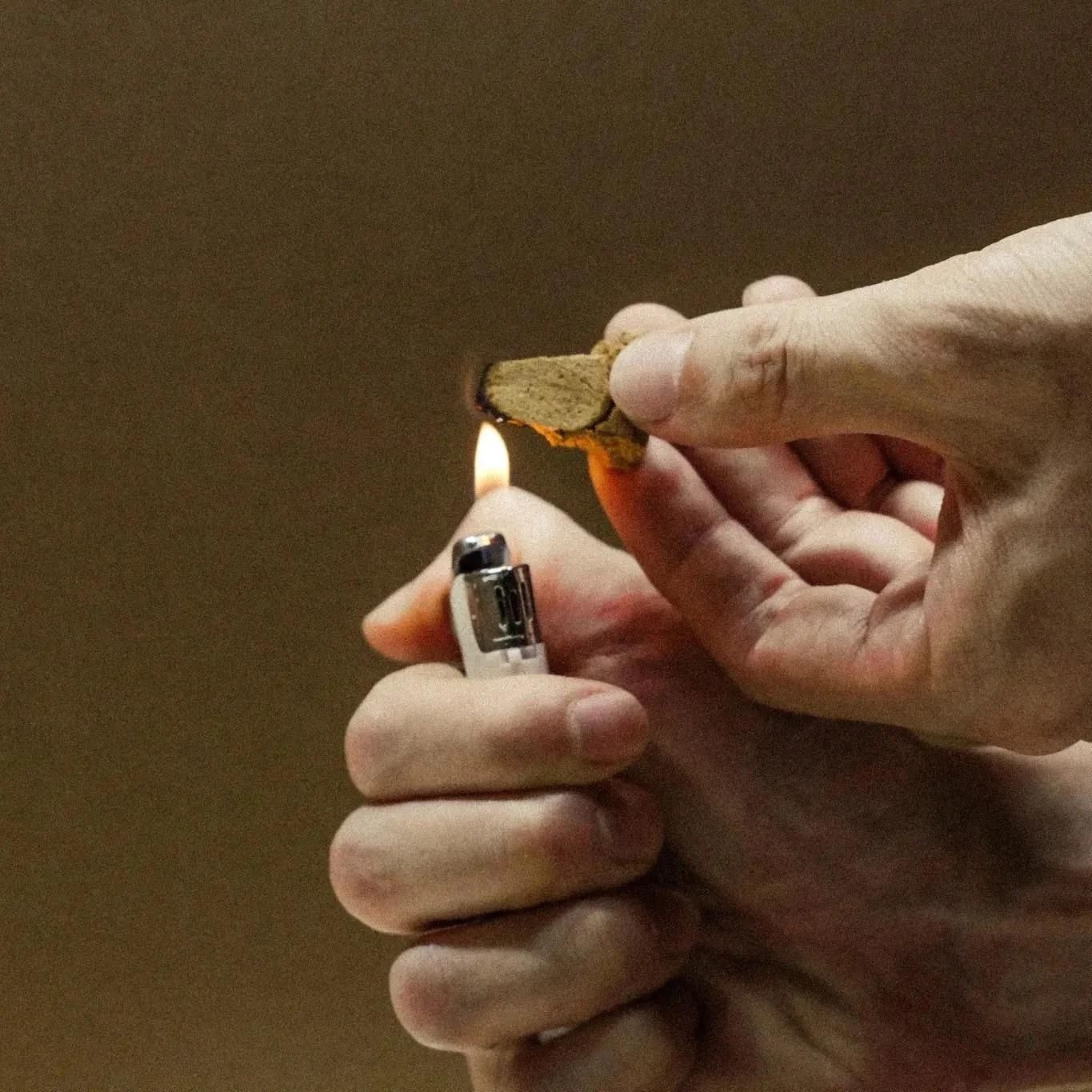 燃焼時間は約30分から40分です。小さく砕き、耐熱皿に乗せて焚きます。少量でもしっかりと燃え、燃焼した後も20分ほどスモーキーでありながら甘さのある、リラックスができるアロマが空間に残ります。広い空間や外で使う際には丸ごと一本を焚くこともできます。燃焼部分が大きいことで熱量が多くなり、燃焼時間は短くなりますが、香りの放出は高まります。